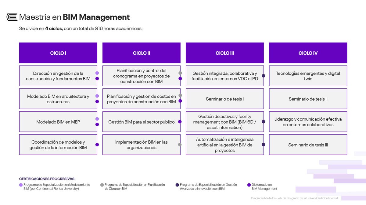 La Maestría en BIM Management de la Escuela de Posgrado de la Universidad Continental brinda contenidos vinculados al modelado y la gestión integral de proyectos de construcción e infraestructura con BIM, conforme a los parámetros establecidos para el uso de esta metodología y a la reglamentación vigente que respalda su aplicación en obras públicas. El estudiante tendrá una visión holística de la industria de la construcción y desarrollará habilidades para la toma de decisiones en el sector en base a los principales indicadores operacionales, además de practicar el estilo de liderazgo situacional para alcanzar el máximo rendimiento en los equipos de trabajo. Asimismo, analizará las tecnologías emergentes aplicadas en proyectos y obras, tales como IoT, big data, inteligencia artificial, realidad aumentada y robótica.
