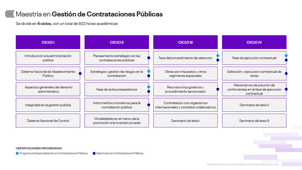 Luego de aprobar todos los cursos y de la sustentación de tu tesis, recibirás el grado de maestro en Gestión de Contrataciones Públicas a nombre de la Escuela de Posgrado de la Universidad Continental.