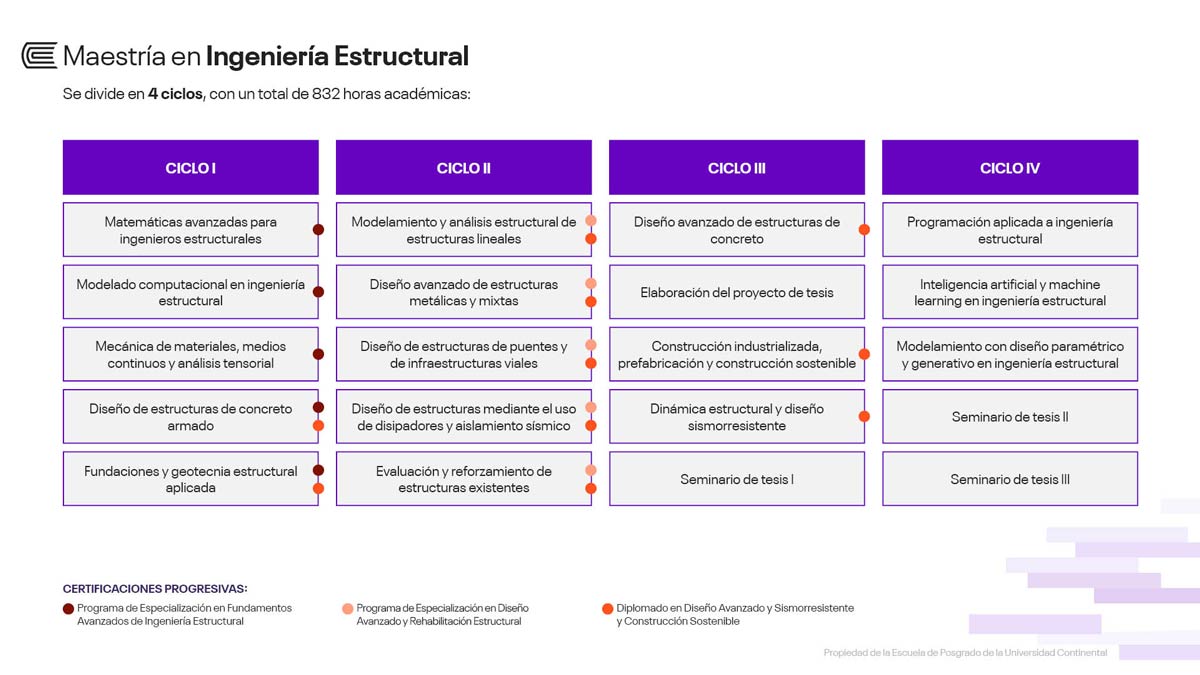 Luego de aprobar todos los cursos y de la sustentación de tu tesis, recibirás el grado de maestro en Ingeniería Estructural, a nombre de la Escuela de Posgrado de la Universidad Continental.