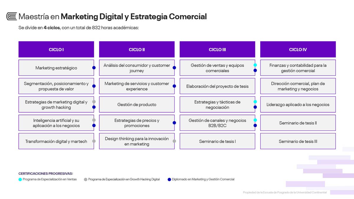 Las organizaciones requieren, hoy en día, líderes que no solo comprendan las dinámicas del mercado digital, sino que también sean capaces de anticipar cambios y generar ventajas competitivas sostenibles. La Maestría en Marketing Digital y Estrategia Comercial de la Escuela de Posgrado de la Universidad Continental surge como respuesta a esta necesidad nacional y regional, con un enfoque integral y articulado que combina la gestión del marketing, la estrategia comercial y la innovación tecnológica, fortaleciendo la capacidad de tomar decisiones basadas en datos en entornos altamente competitivos, globalizados y en constante evolución.