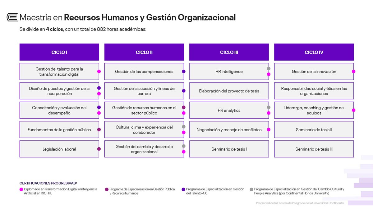 Luego de aprobar todos los cursos y de la sustentación de tu tesis, recibirás el grado de maestro en Recursos Humanos y Gestión Organizacional a nombre de la Escuela de Posgrado de la Universidad Continental.
