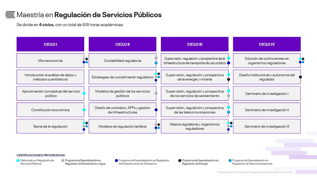 Luego de aprobar todos los cursos y de la sustentación de tu tesis, recibirás el grado de maestro en Regulación de Servicios Públicos a nombre de la Escuela de Posgrado de la Universidad Continental.