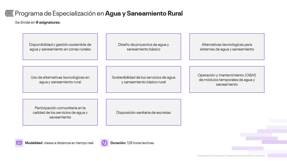 Luego de aprobar todas las asignaturas del programa se te otorgará el certificado de especialista en Agua y Saneamiento Rural, a nombre de la Escuela de Posgrado de la Universidad Continental.