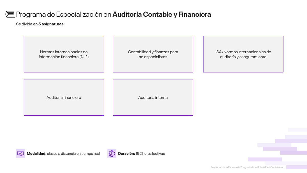 Luego de aprobar todas las asignaturas del programa se te otorgará el certificado de especialista en Auditoría Contable y Financiera, a nombre de la Escuela de Posgrado de la Universidad Continental.