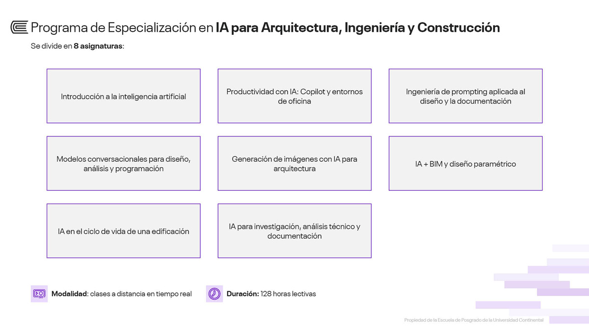 Los avances recientes en inteligencia artificial han generado un impacto directo en las metodologías de diseño, modelado, documentación y análisis técnico dentro del sector AEC (arquitectura, ingeniería y construcción). El Programa de Especialización en IA para Arquitectura, Ingeniería y Construcción de la Escuela de Posgrado de la Universidad Continental ha sido diseñado para formar profesionales capaces de utilizar la IA a lo largo de las etapas de los proyectos del sector, con un enfoque práctico, productivo y estratégico, orientado a optimizar la eficiencia y la innovación en los entornos profesionales.