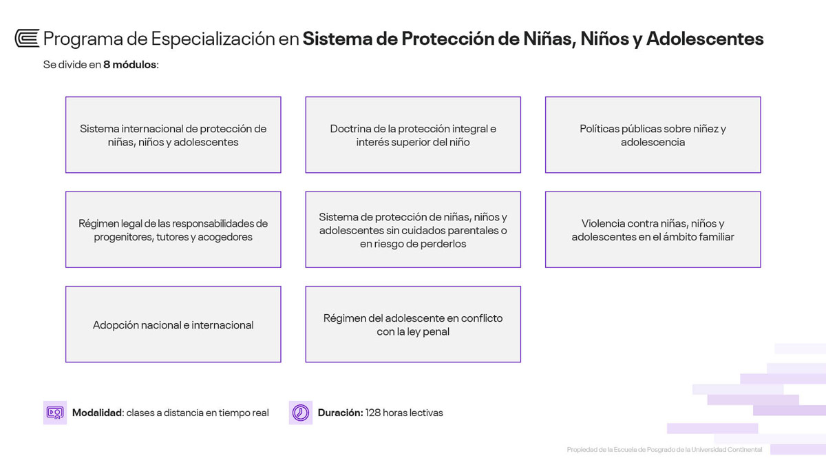 Luego de aprobar todos los módulos del programa se te otorgará el certificado de especialista en Sistema de Protección de Niñas, Niños y Adolescentes, a nombre de la Escuela de Posgrado de la Universidad Continental.