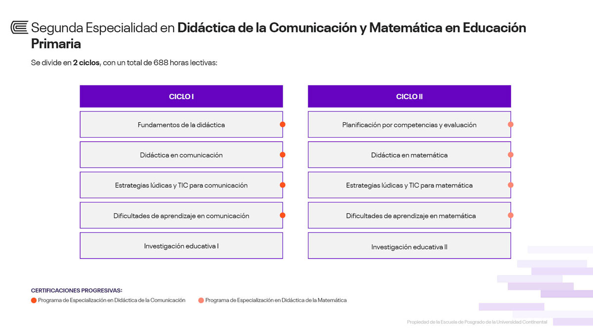 La Segunda Especialidad en Didáctica de la Comunicación y Matemática en Educación Primaria de la Escuela de Posgrado de la Universidad Continental es una propuesta innovadora y holística que reconoce la complejidad del proceso educativo y la necesidad de formar docentes con competencias específicas, capaces de articular teoría y práctica en contextos diversos. Esta especialidad responde a las demandas actuales de la Educación Básica Regular en el Perú y presenta un diseño curricular fundamentado en el Currículo Nacional de la Educación Básica (CNEB), aprobado mediante la Resolución Ministerial N.° 281-2016-MINEDU y sus modificatorias, y se alinea estrechamente con el Marco del Buen Desempeño Docente, la Política Nacional de Educación al 2030 y los estándares de formación docente.