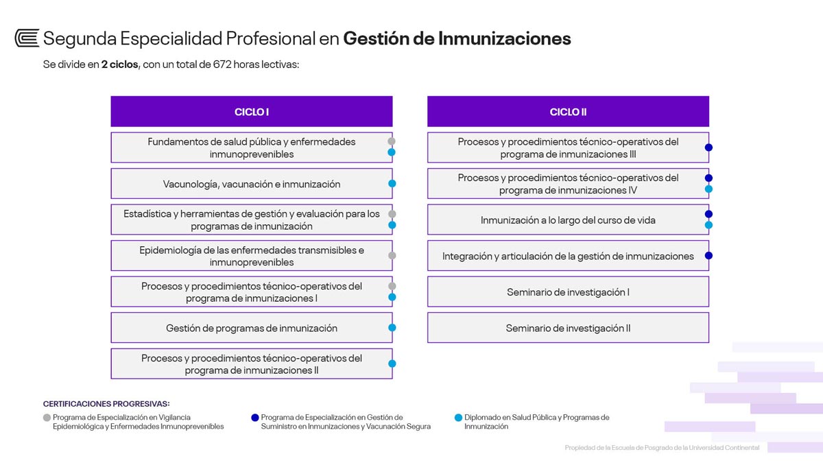 Las enfermedades inmunoprevenibles continúan representando un desafío prioritario para los sistemas de salud pública, por lo que la OMS y sus aliados estratégicos, en el marco de la Agenda de Inmunización 2030, subrayan la necesidad de fortalecer la gestión de los programas de inmunización y las capacidades del recurso humano, con el fin de revertir la disminución de coberturas, reducir inequidades y garantizar sistemas de vacunación sostenibles y resilientes. En este contexto, la Segunda Especialidad Profesional en Gestión de Inmunizaciones de la Escuela de Posgrado de la Universidad Continental brinda una formación avanzada orientada al desarrollo de competencias técnicas y de gestión para la planificación, implementación y evaluación de las inmunizaciones en los distintos niveles de atención y escenarios sanitarios, incluyendo emergencias y pandemias.